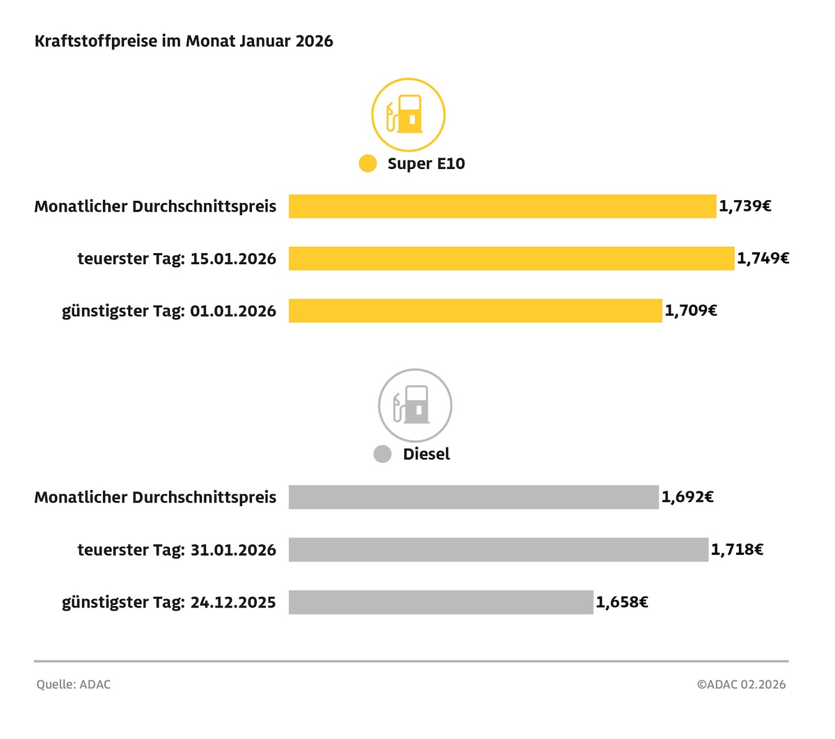 Nach der aktuellen Auswertung des ADAC lag der durchschnittliche Preis für einen Liter Super E10 im Januar bei 1,739 Euro. Gegenüber dem Dezember entspricht das einem Anstieg um 8,6 Cent je Liter. Diesel verteuerte sich im selben Zeitraum sogar noch stärker: Im Schnitt wurden 1,692 Euro pro Liter fällig, 9,4 Cent mehr als im Vormonat. Damit verringerte sich der Abstand zwischen beiden Sorten deutlich. Diesel war im Januar nur noch 4,7 Cent günstiger als Super E10, obwohl auf einen Liter Diesel nach wie vor rund 20 Cent weniger Energiesteuer erhoben werden.