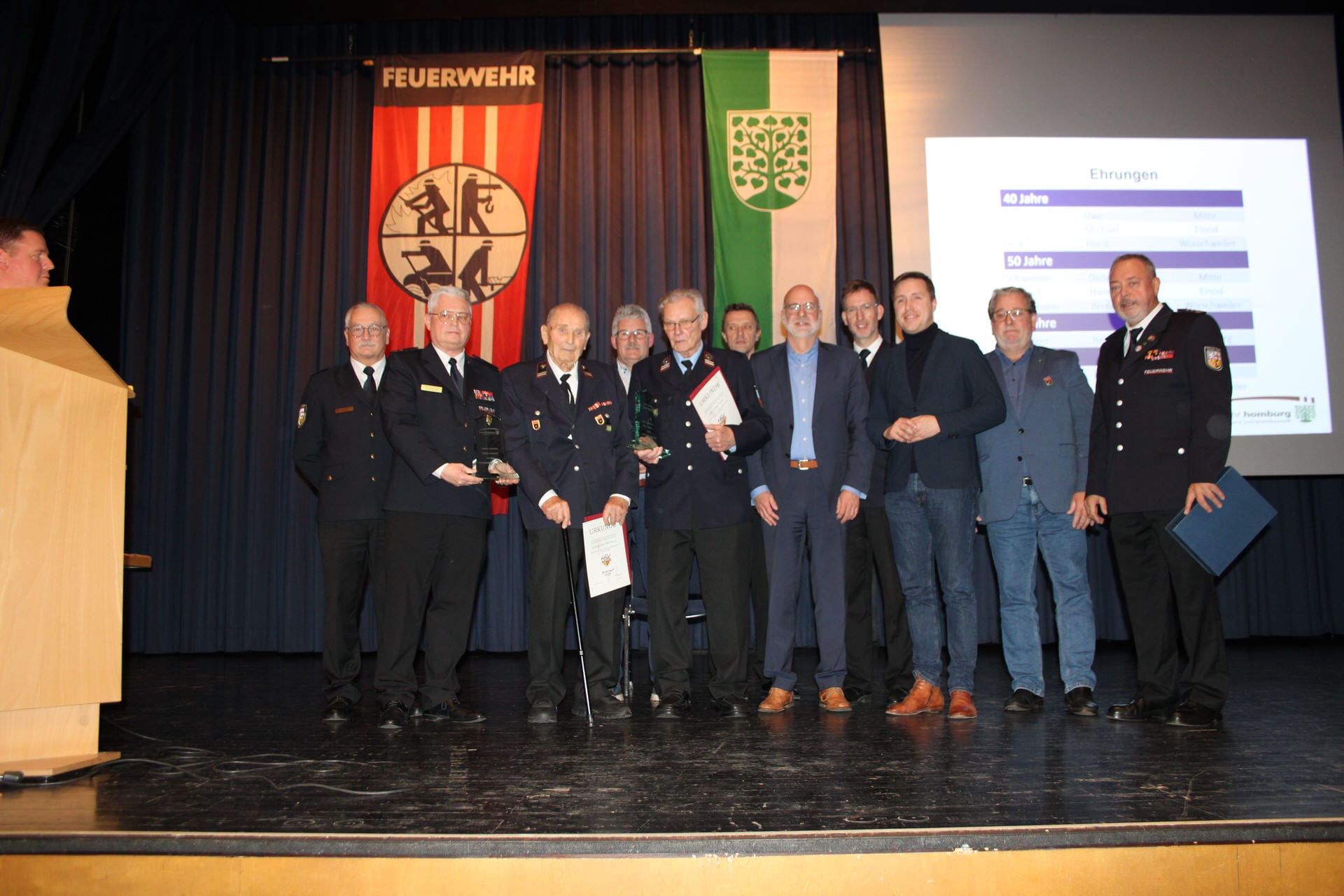 Ein weiterer emotionaler Moment galt Hans-Peter Schad vom Löschbezirk Homburg-Mitte. Er wurde nach mehr als 50 Jahren im aktiven Dienst zunächst in die Alterswehr übernommen. Zum Abschluss des Ehrungsblocks wurde er noch einmal auf die Bühne gebeten und – für ihn überraschend – mit dem Deutschen Feuerwehr-Ehrenkreuz in Bronze des Deutschen Feuerwehrverbandes ausgezeichnet. Claus Kürsteiner würdigte als stellvertretender Präsident des Landesfeuerwehrverbands die vielfältigen Verdienste Schads um den Löschbezirk Mitte, um die Ausbildung und den Zusammenhalt in der Feuerwehr. Währenddessen erhoben sich alle Anwesenden von ihren Plätzen und spendeten lange Applaus für den sichtlich gerührten Feuerwehrmann.