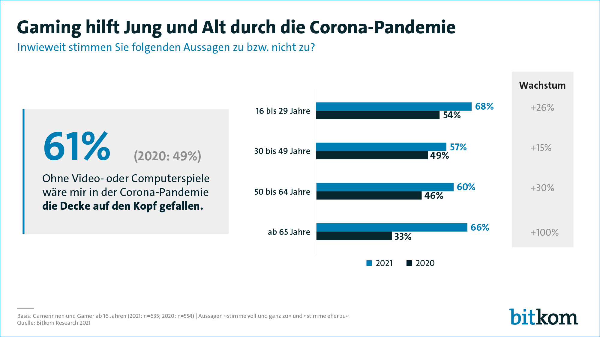Neben den Jüngeren zwischen 16 und 29 Jahren (68 Prozent) profitieren besonders Senioren von dieser Art der Freizeitbeschäftigung: Aus der Gruppe 65 plus hilft Gaming zwei Dritteln (66 Prozent) durch die Pandemie – das sind doppelt so viele wie noch im Jahr 2020 (33 Prozent). Das sind Ergebnisse einer repräsentativen Befragung unter 1.269 Personen ab 16 Jahren in Deutschland, die vom Digitalverband Bitkom in Auftrag gegeben wurde. „Gaming spielt schon länger eine wichtige Rolle in unserem Alltag. Doch die Bedeutung von Video- und Computerspielen ist in diesem Jahr noch mal deutlich gestiegen“, sagt Olaf May, Mitglied des Bitkom-Präsidiums. „Der Blick auf die vorliegenden Befragungsergebnisse zeigt, dass die digitale Spielewelt viel mehr ist als nur Zeitvertreib. Sie wird zunehmend zum zentralen Element, um das eigene Wohlbefinden zu steigern, in Kontakt mit anderen zu bleiben und Nähe zu finden.“