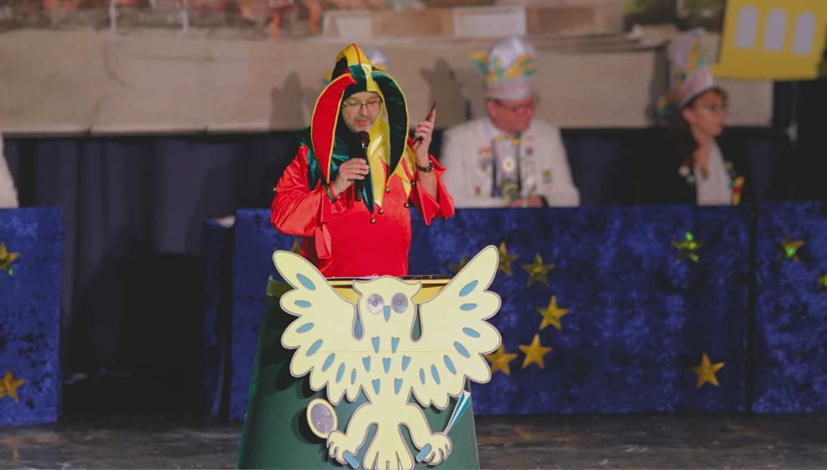 In der Bütt verlagerte sich der Schwerpunkt auf Wortwitz und politische Einordnung. Ansgar Hoffmann trat als „Till“ auf und spannte den Bogen von der Bundespolitik bis in die lokale Verwaltung. Spitzen gegen das Rathaus blieben nicht aus – etwa die Bemerkung, man arbeite dort inzwischen „KI-basiert“, was er süffisant mit „krank oder inkompetent“ übersetzte. Auch „Wellnessa Schwitz-Stink“ sorgte für viel Resonanz im Saal. „Fidelius“ (Christoph Lesch) analysierte als „Frustberater“ das politische Saarland und kombinierte seine Parodien mit musikalischen Elementen.