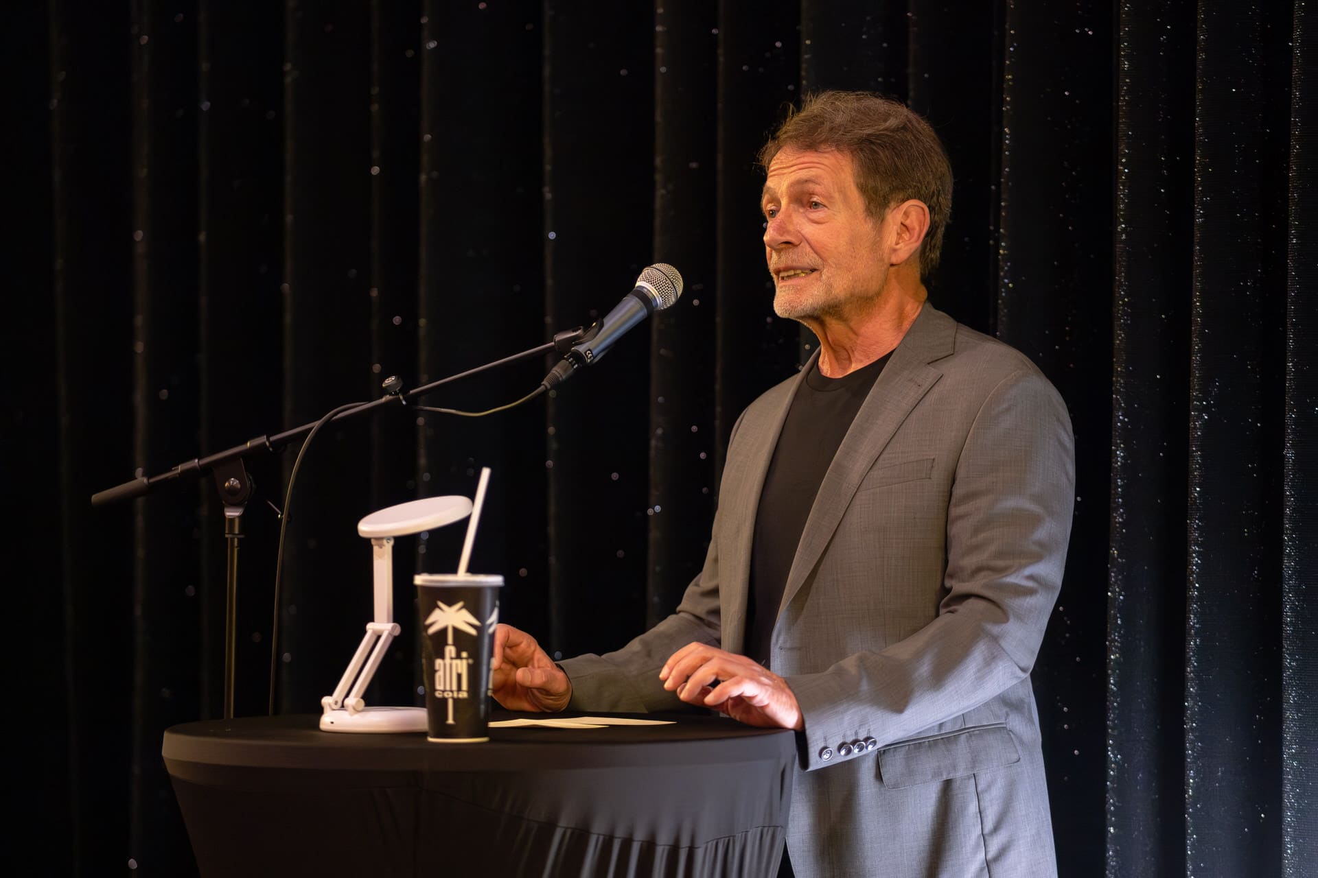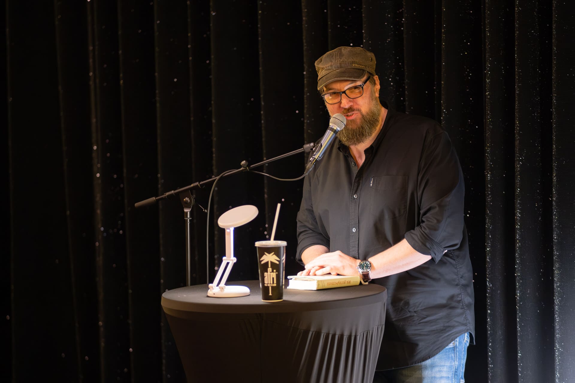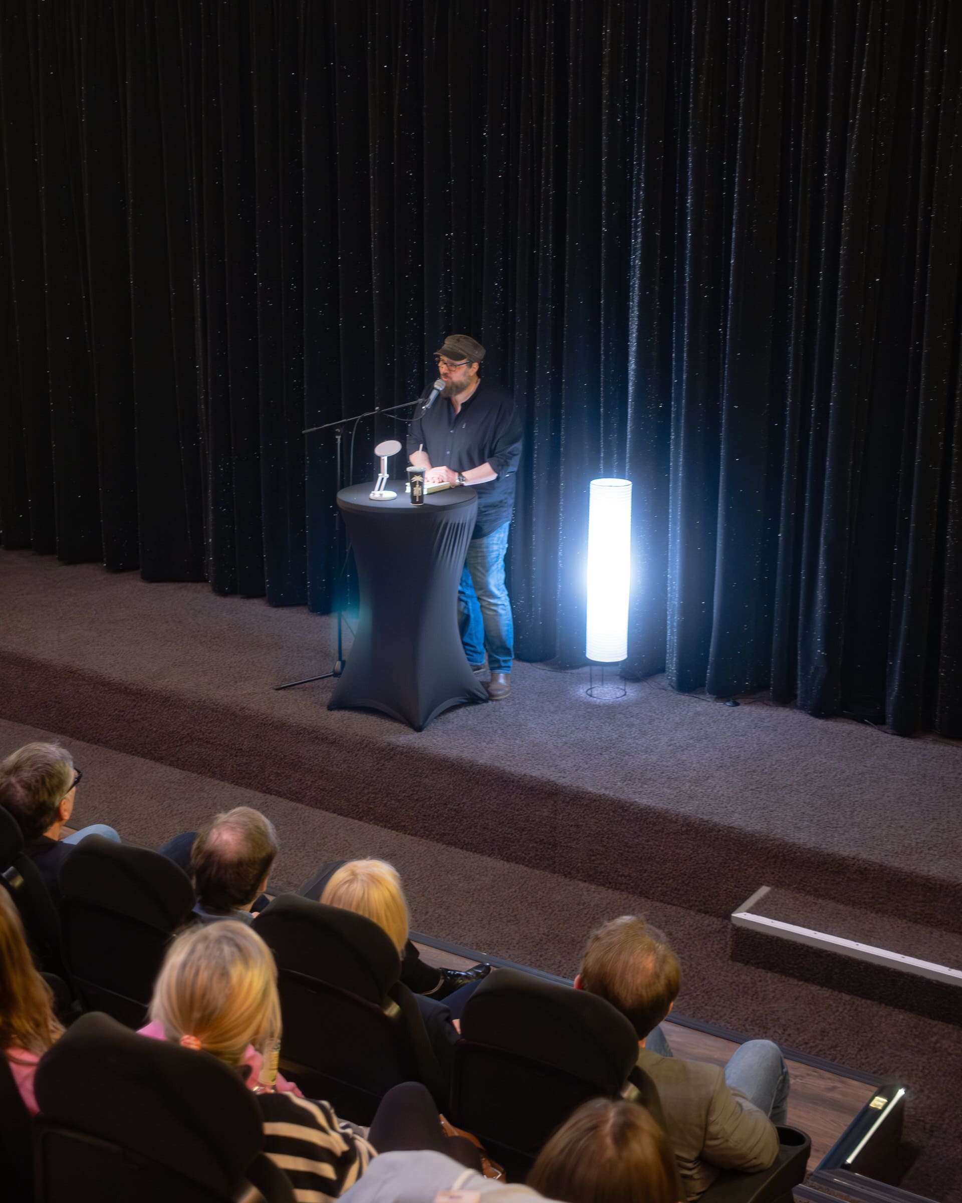 Dann liest der sympathische Autor – und man merkt schnell: Er liest nicht nur, er spielt. Stimmen, Pausen, Mini-Gesten. Ursel Schäfer, Sabine Gruber, Karl Kollhoff treten ins Licht. Dieser Karl, der abends Bücher einpackt, verschnürt, zu Fuß ausliefert. Statt bloßer Textwiedergabe entsteht eine kleine Szene, in der der Ton die Figuren führt. Besonders die Passage, in der Schascha, das neunjährige Mädchen mit den bunten Locken, zum ersten Mal neben Karl auftaucht, verursacht, dass das Publikum mucksmäuschenstill wird. Es wird wie in die Geschichte hineingezogen.