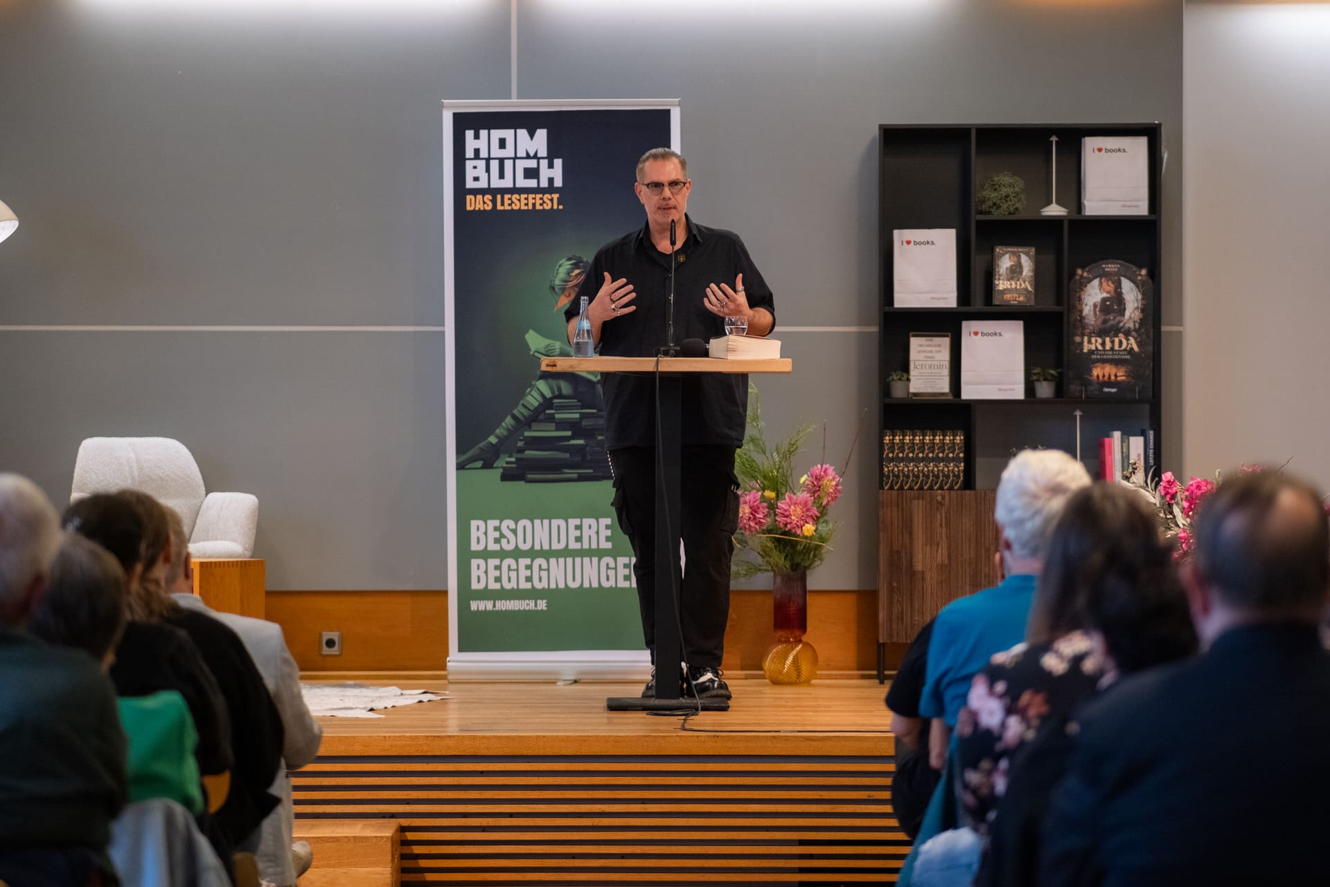 Der Himmel über Homburg war bereits tintenblau, als sich die Türen des Siebenpfeifferhauses öffneten und der große Saal sich im Nu füllte. Familien mit neugierigen Kindern, Jugendliche mit leuchtenden Augen, Erwachsene mit Heitz-Bänden unterm Arm – das Publikum war, wenn auch zumeist schwarz gekleidet, bunt gemischt und bereit für einen magischen Abend. Man spürte einfach diese prickelnde Erwartung, die nur entsteht, wenn ein Autor kommt, der mehr kann, als aus dem eigenen Werk vorzulesen: jemand, der Welten aufzieht, seine Figuren atmen lässt und seine Umgebung als Erzählraum begreift.