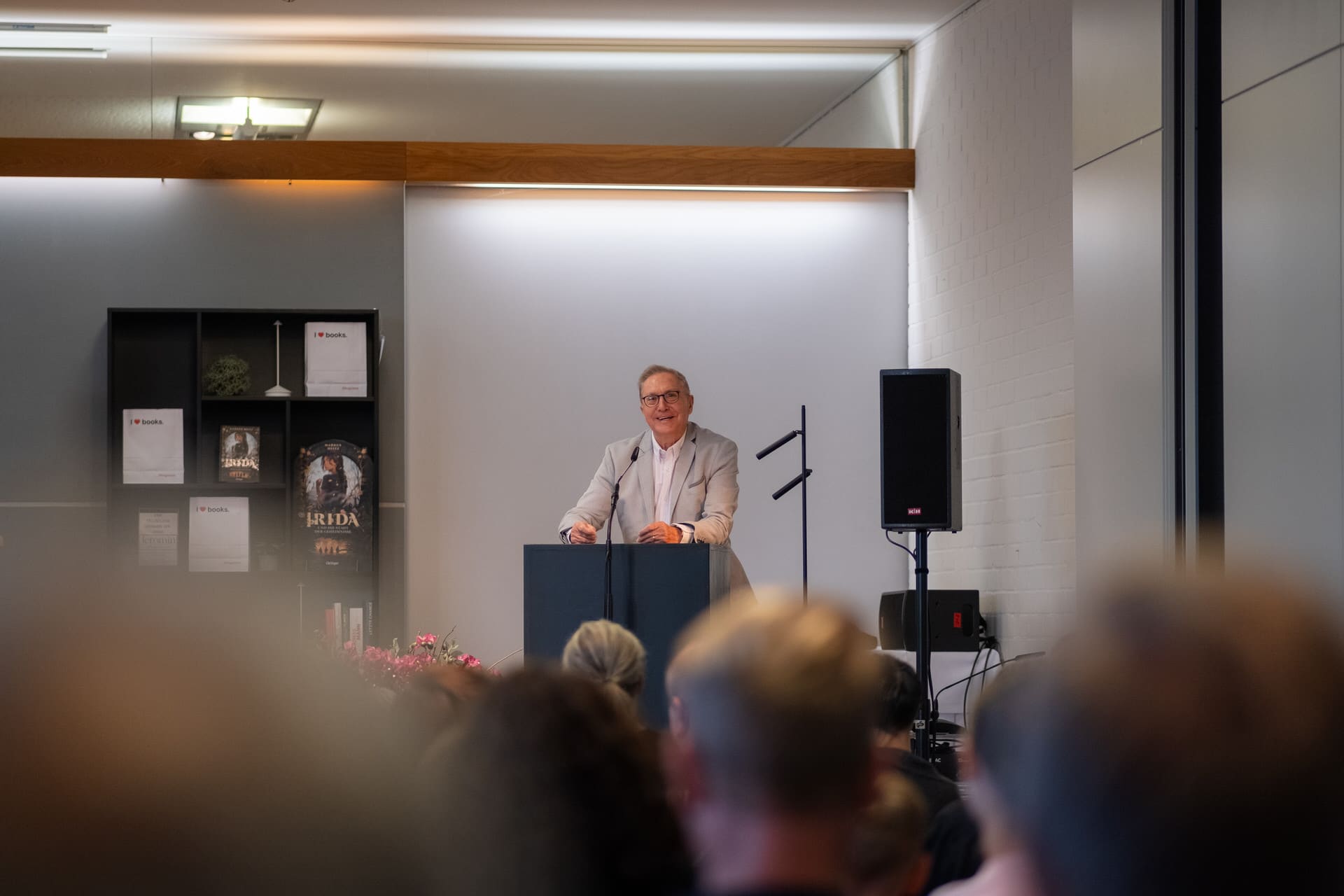 Den Auftakt machte Veranstalter Hans-Joachim Burgardt. Er nutzte den Abend, um die „Homburger Schreibfeder“ vorzustellen: einen Wettbewerb für die Klassenstufen 5 bis 7, bei dem Kinder und Jugendliche eigene Märchen, Sagen und Legenden mit Homburg-Bezug einreichen können – inklusive Preisgeld für die Klassenkassen. Wichtig dabei: Die Ursprungsidee hatte Markus Heitz selbst schon früher eingebracht; Burgardt und sein Team griffen sie auf und machten daraus ein Projekt. Burgardt erzählte zudem von einem alten Zeitschriftenfoto – ein Junge, allein in der Straßenbahn, vertieft in ein Buch, unterschrieben mit „Seltene Aufnahme einer aussterbenden Art“. „Das hat mich getroffen“, sagte er. Seine Stimme verriet, wie nah dem Literaturförderer das Thema geht.