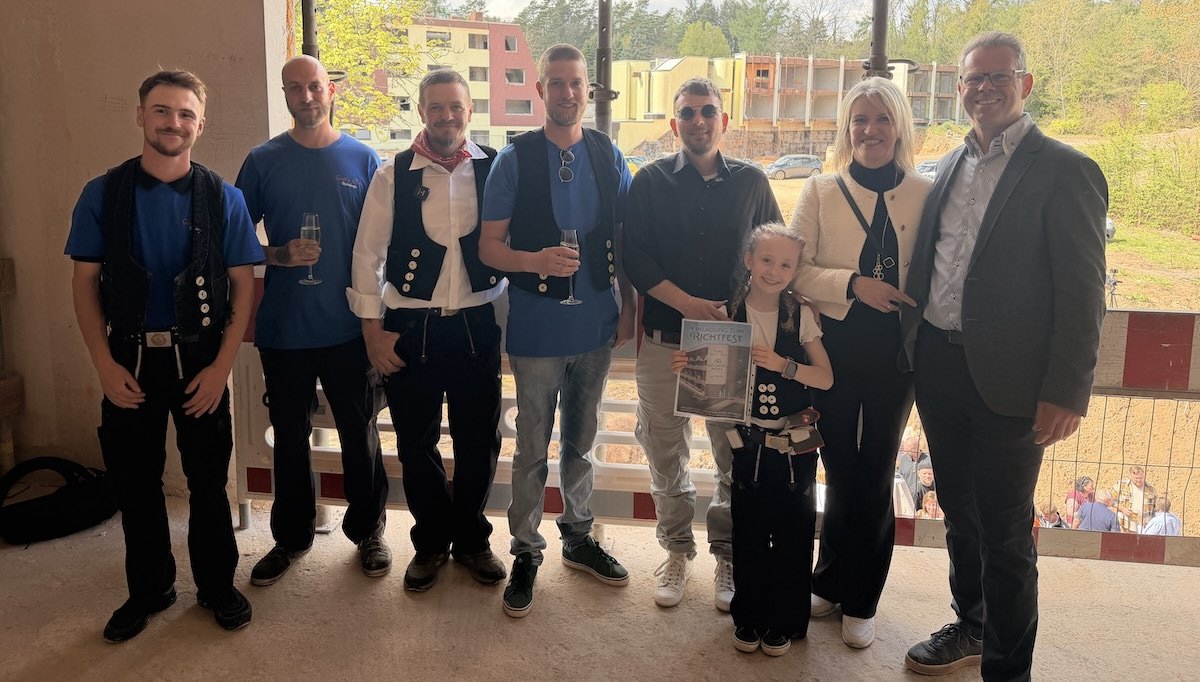 Den stimmungsvollen Höhepunkt des Festes bildete das Verlesen des Richtspruchs, überreicht vom Dachdeckerbetrieb Regin, der mit einer alten Handwerkstradition dem Neubau seinen Segen gab: „Heute ruft man uns zum Feste, denn das Schwerste ist geschafft. Hier in wunderschöner Lage – feiern wir das Richtfest heut, was in ganz besondren Maße – unsere Bauherrschaft erfreut.“ Und am Ende, als der Richtkranz hoch über dem Gebäude wehte: „Nun mag das Glas am Grund zerspringen – und diesem Haus nur Gutes bringen.“