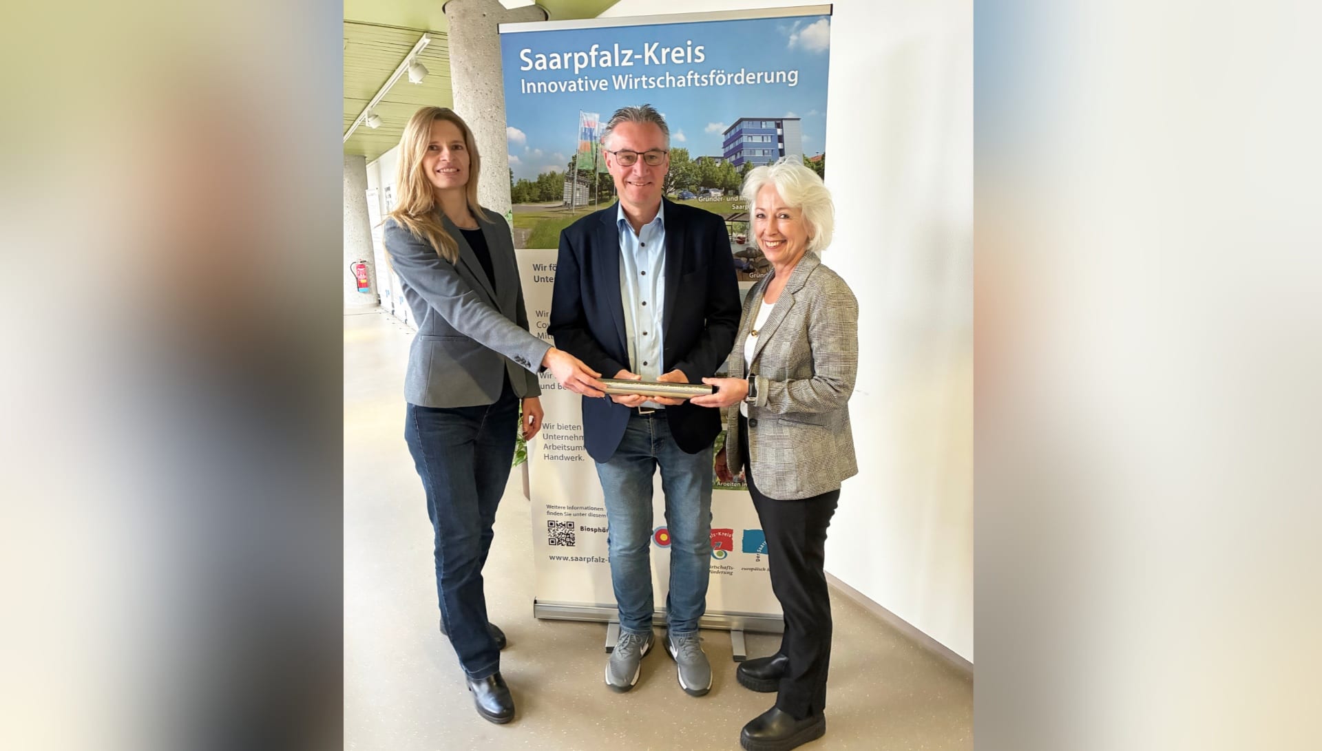 Bildunterschrift: Landrat Frank John bei der Staffelübergabe mit neuer und aktueller Geschäftsführerin der Wirtschaftsförderungsgesellschaft Saarpfalz (WFG). Doris Gaa (rechts) verabschiedet sich nach mehr als drei Jahrzenten engagierter Wirtschaftsförderung zum Jahresende in den Ruhestand. Ab Januar 2026 übernimmt Alexandra Heß (links), die seit mehr als 21 Jahren bei der WFG in leitender Position tätig ist, die Geschäftsführung.