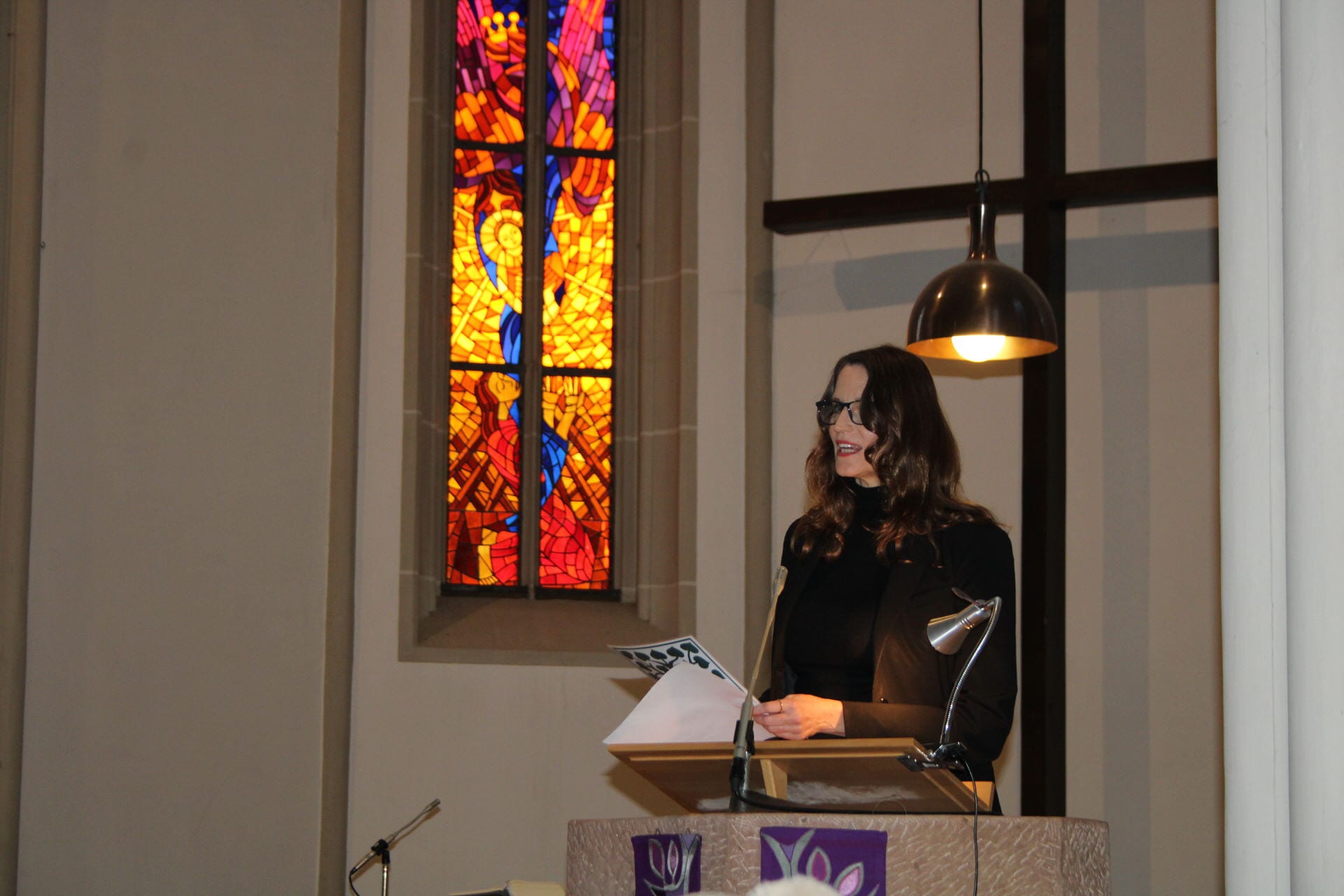 Durch das Programm führte Pfarrerin Petra Scheidhauer. Hauptrednerin war Joanna Bergin, die Tochter der in Homburg geborenen Übersetzerin und Schriftstellerin Edith Aron. Sie berichtete über Lebensstationen ihrer Mutter, trug eine Kurzgeschichte von Edith Aron und ihr Gedicht „What is a refugee“ vor. Beim anschließenden Schweigegang zur Synagogenruine sprach die ehrenamtliche Beigeordnete für Jugend, Nachhaltigkeit und Tierschutz, Nathalie Kroj.