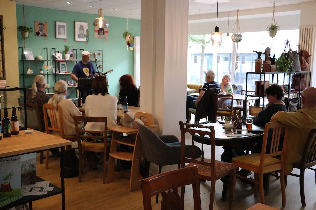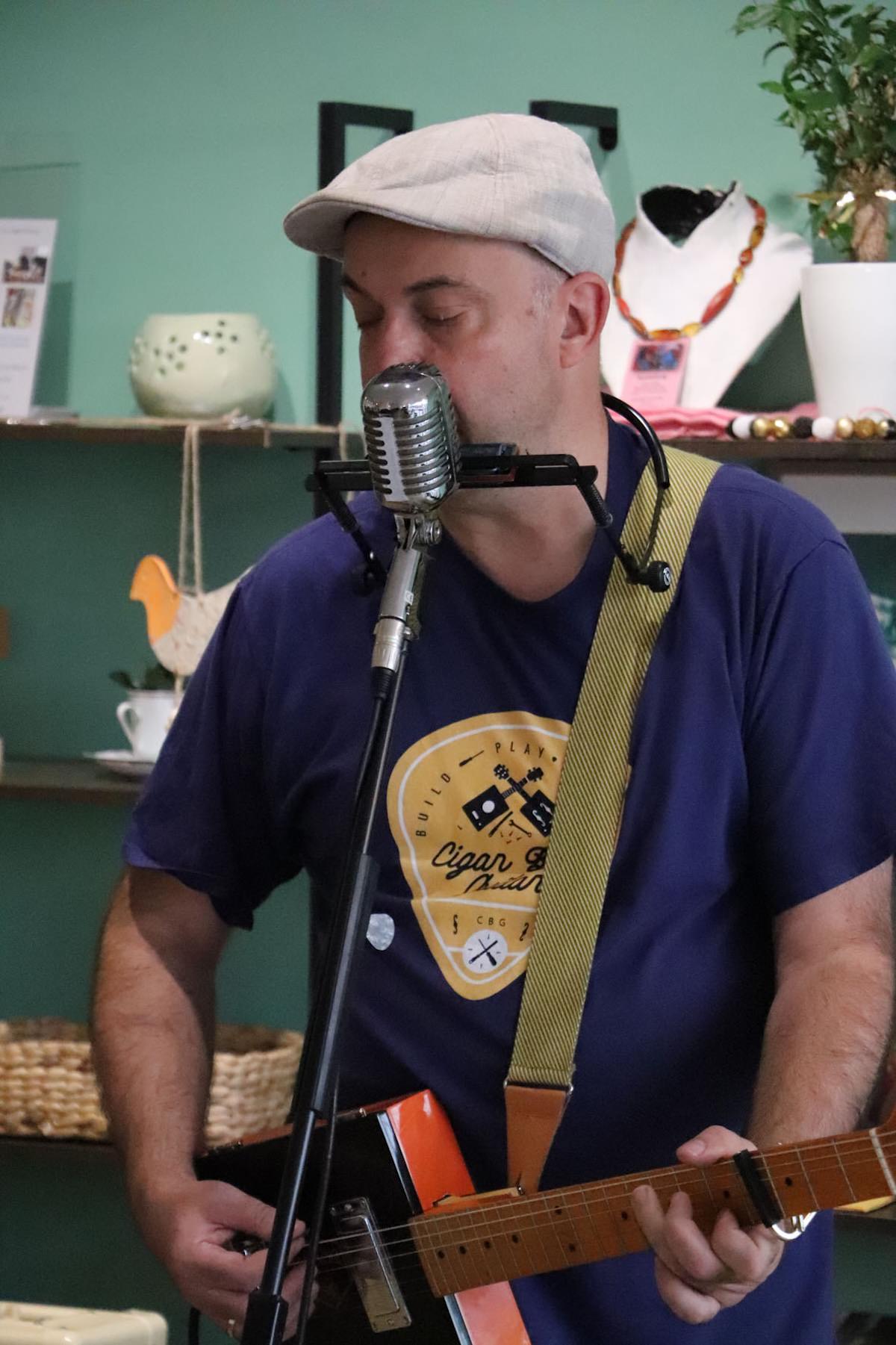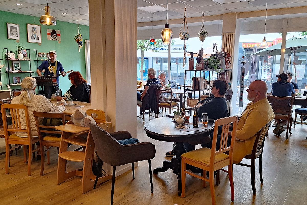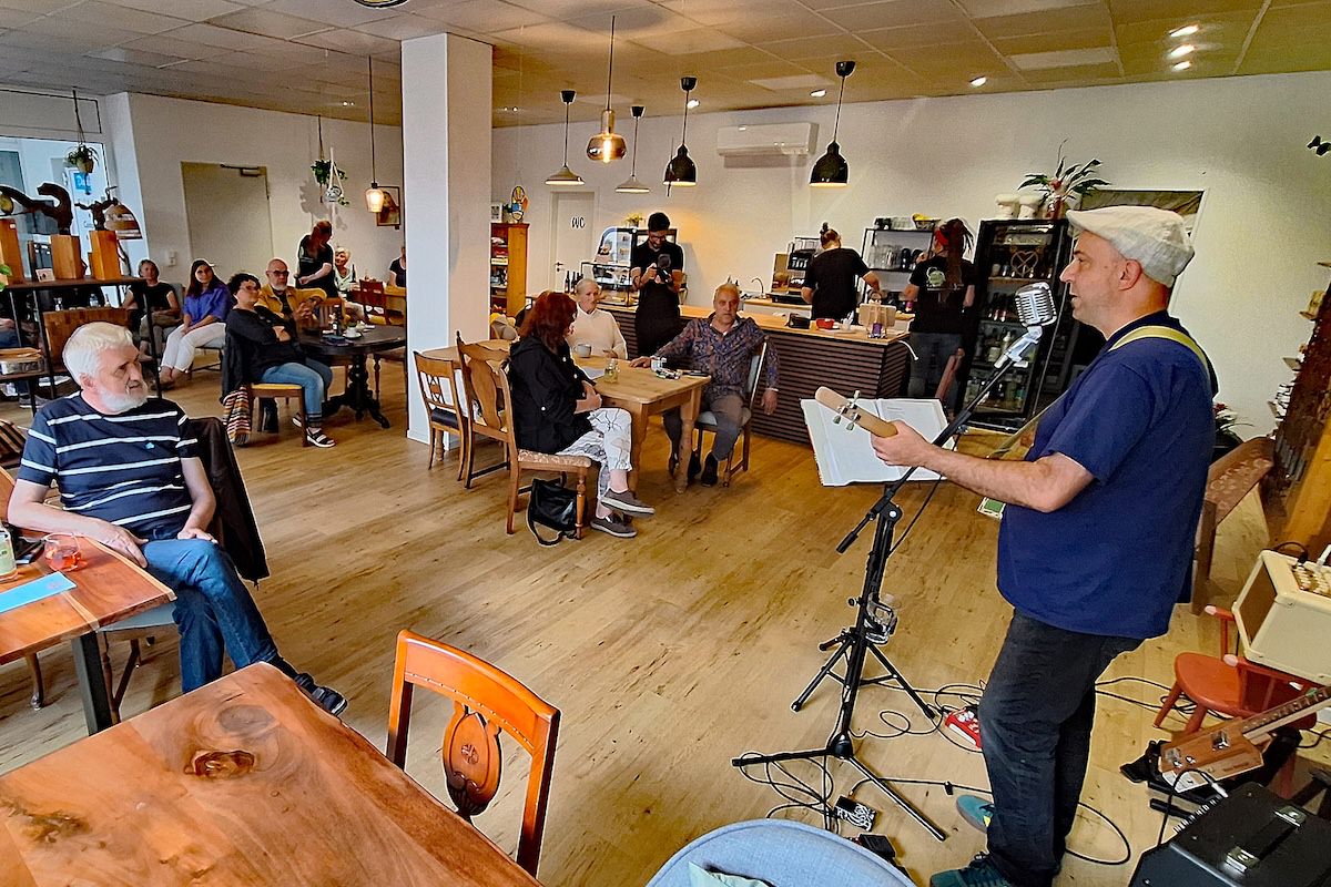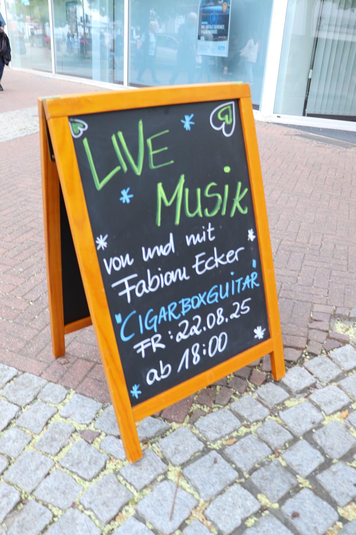 Einen stimmungsvollen Freitagabend erlebten die Gäste der GenussWerkstatt am 22. August in der Homburger Fußgängerzone: Musiker und Gitarrenbauer Fabian Ecker war zu Gast – mit selbstgebauten Cigarbox-Gitarren und einem Repertoire zwischen Blues, Rock und Klassikern. Es war sein erster Auftritt in dem inklusiv geführten Café – und einer, der ihm wie dem Publikum gleichermaßen in Erinnerung bleiben dürfte.